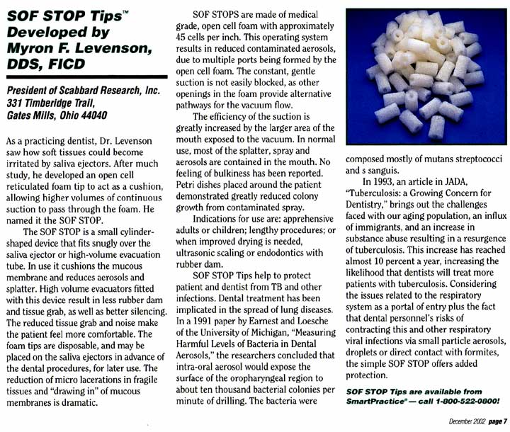 Sof Stop is a simple device for dental practitioners that enhances the effectiveness of the standard saliva ejector or HVE. It is a soft foam tip that fits over Saliva Ejectors and HVE's. In construction, it is a soft foam cylinder made with medical grade polyether foam of 45 cells per inch. This type of foam is used in dialysis machines, blood filters, and open-heart surgery machines. SofStop is the Simple Solution to: